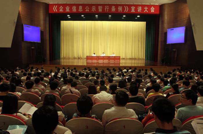 [安徽轻工网讯·据省工商局网站] 日前,省工商局在安徽大剧院举办《企业信息公示暂行条例》宣讲大会,省工商局副局长吴良斯出席大会并讲话,省工商局政治部副主任陆红主持会议。省直有关部门处室负责同志、在省工商局注册登记的企业的负责人或负责年度报告的工作人员及省工商局相关处室工作人员共1500余人参加了大会。