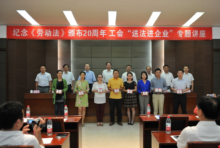 [安徽轻工网讯] 为进一步提高集团依法治企水平和职工的法律素养,使工会法律服务工作更贴近企业职工,恰逢《劳动法》颁布20周年纪念之际,日前,省总工会、省直工会来我集团开展“送法进企业”专题讲座活动。