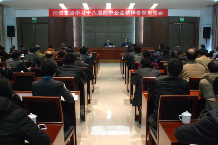 [安徽轻工网讯] 为深入学习贯彻党的十八届四中全会精神,坚定全面推进“依法治国”指导思想,日前,省国贸集团公司党委举办学习党的十八届四中全会精神专题报告会,特邀中共安徽省委党校省情研究中心负责人、管理学副教授、党的十八届三中、四中全会宣讲团成员张彪作专题报告。集团本部全体人员、集团所属各单位领导班子成员、党支部书记代表、党员代表共100余人参加了会议,会议由集团党委书记、董事长范阳主持。