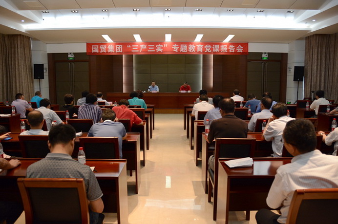 [安徽轻工网讯] 按照省国资委党委统一部署,日前,省国贸集团举办“三严三实”专题教育活动党课报告会,集团公司党委书记、董事长范阳作专题报告。会议由集团公司党委副书记、总经理包祥华主持,集团公司本部全体员工、集团各企业党组织主要负责人、领导班子成员听取了报告。